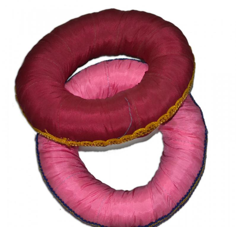 The Ghatam ring is the base ring that is used for the ghatam to sit properly. It provides a sturdy base for the player and also renders stability to the ghatam. The ghatam rings are made out of straw and covered with cotton fabric. The rings can hold upto 7 kgs of weight consistently without collapsing. The rings have a circular lace covering the ring.